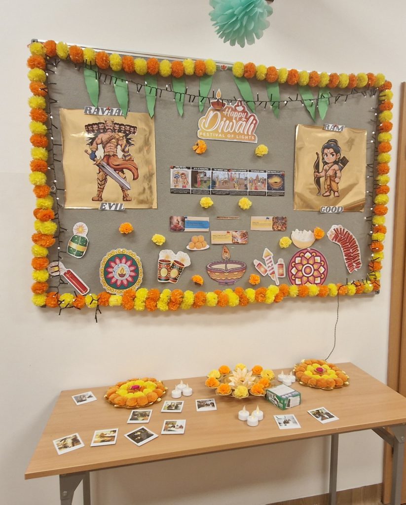 Primary students enjoyed a wide variety of engaging activities throughout the day, including Pumpkin Bowling, Spooky Candy Toss, Chess Corner, and Curse-Breaking Puzzles. As part of Diwali Discovery, pupils learned about the story behind the festival by watching a short educational video. In Marigold Memories, they crafted autumn keepsakes using air clay, combining creativity with seasonal reflection.